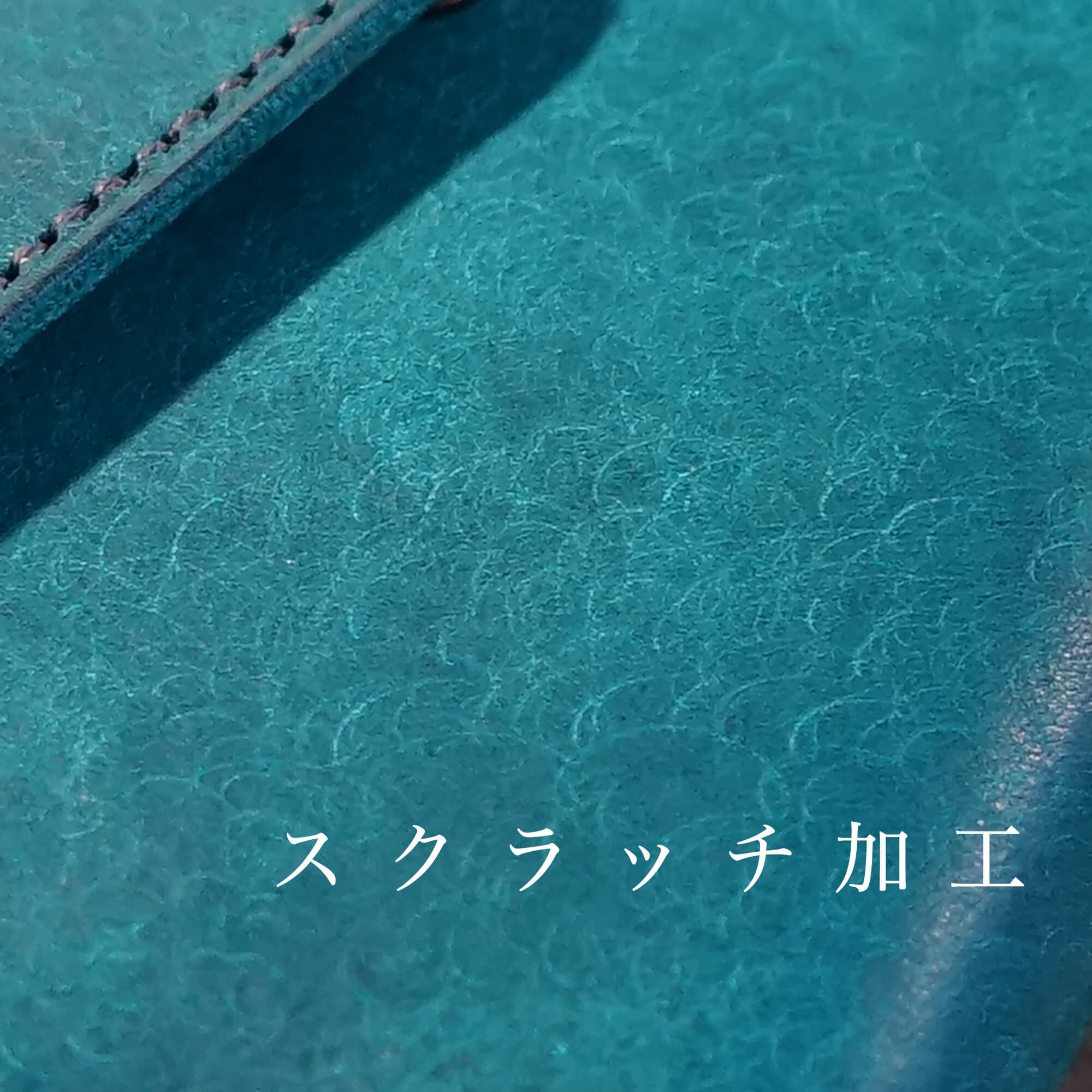 円を描くような傷がたくさんついているのがスクラッチ加工です。この加工で革にビンテージのような印象があり、革の表面は毛羽立ち、手触りはざらっとしています。上質なヌメ革のもちっとした感覚も堪能できます。